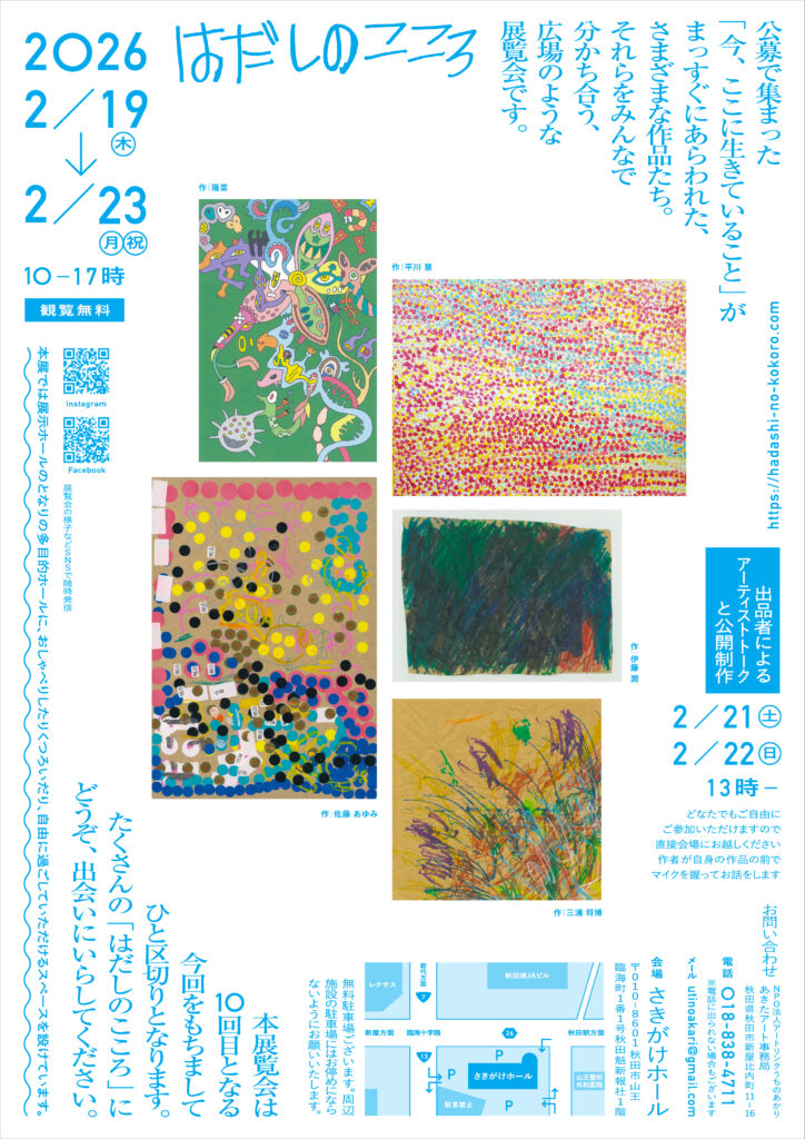 第10回あきたアート「はだしのこころ」のメインチラシが完成し絶賛配布中です。今回のメインビジュアルはピンクとハートが印象的な小西マリアさんの作品です。